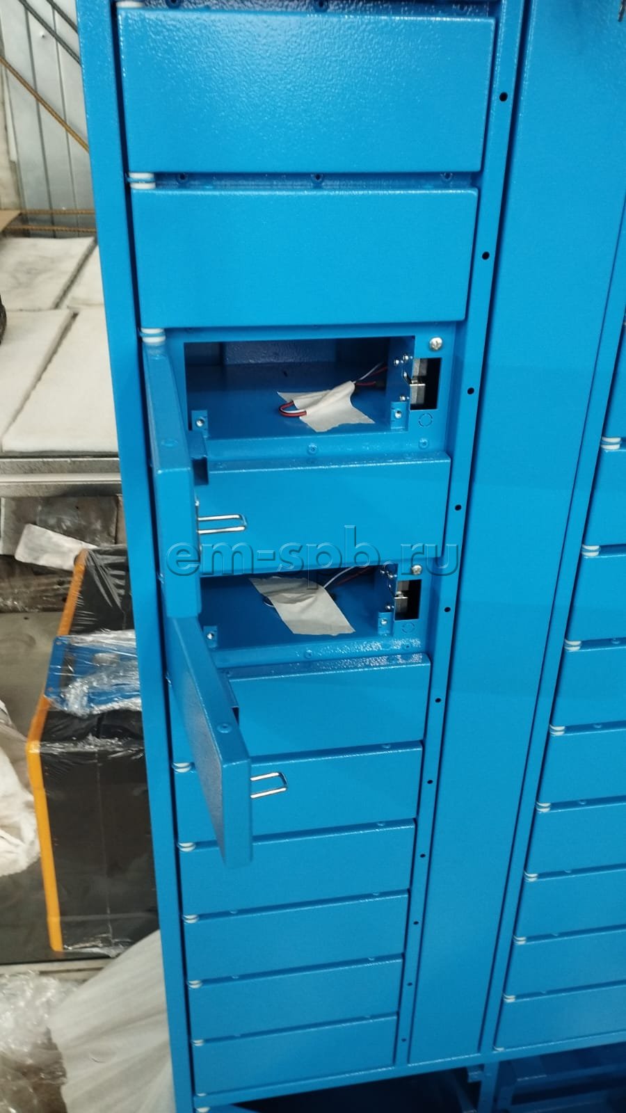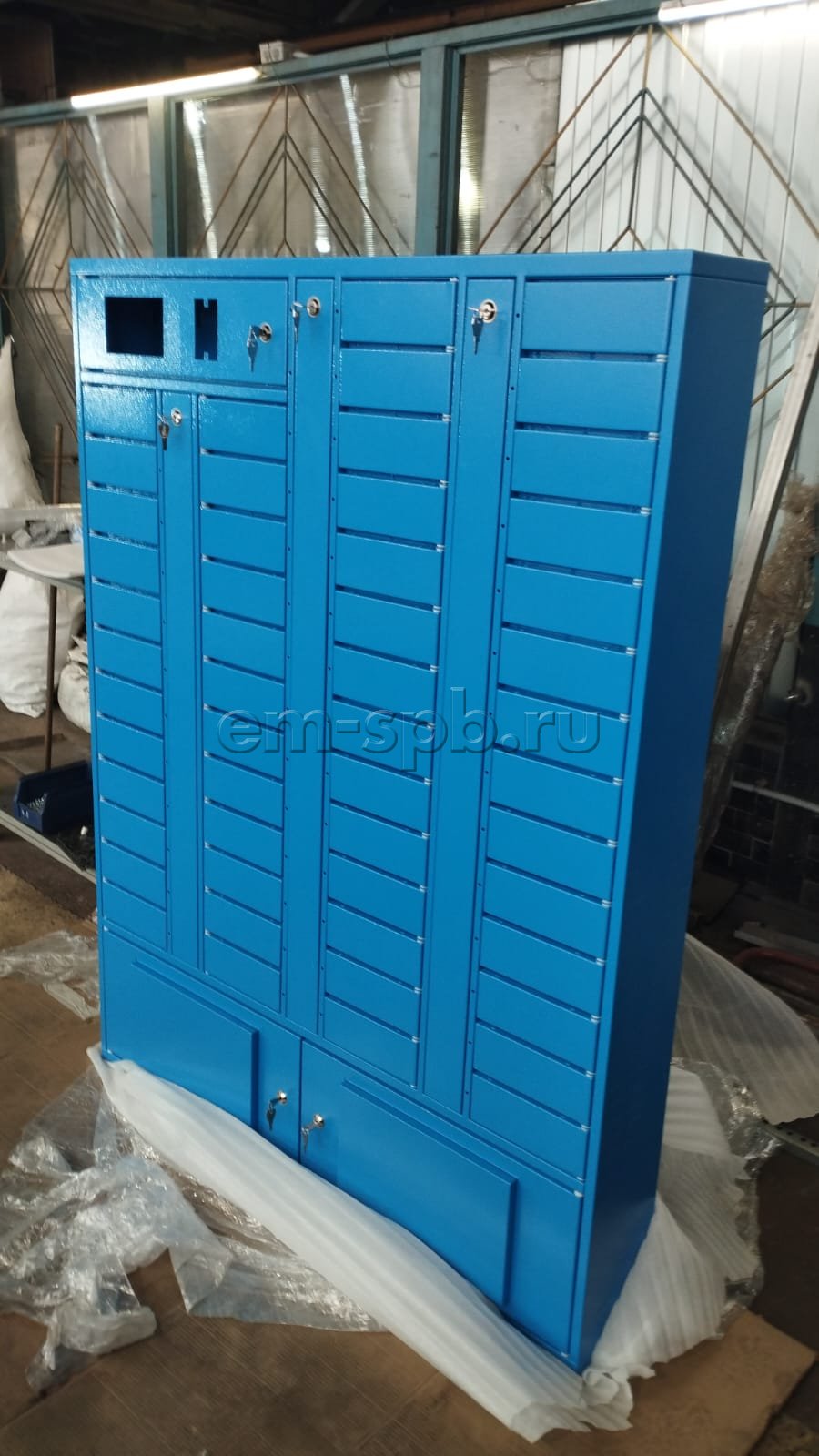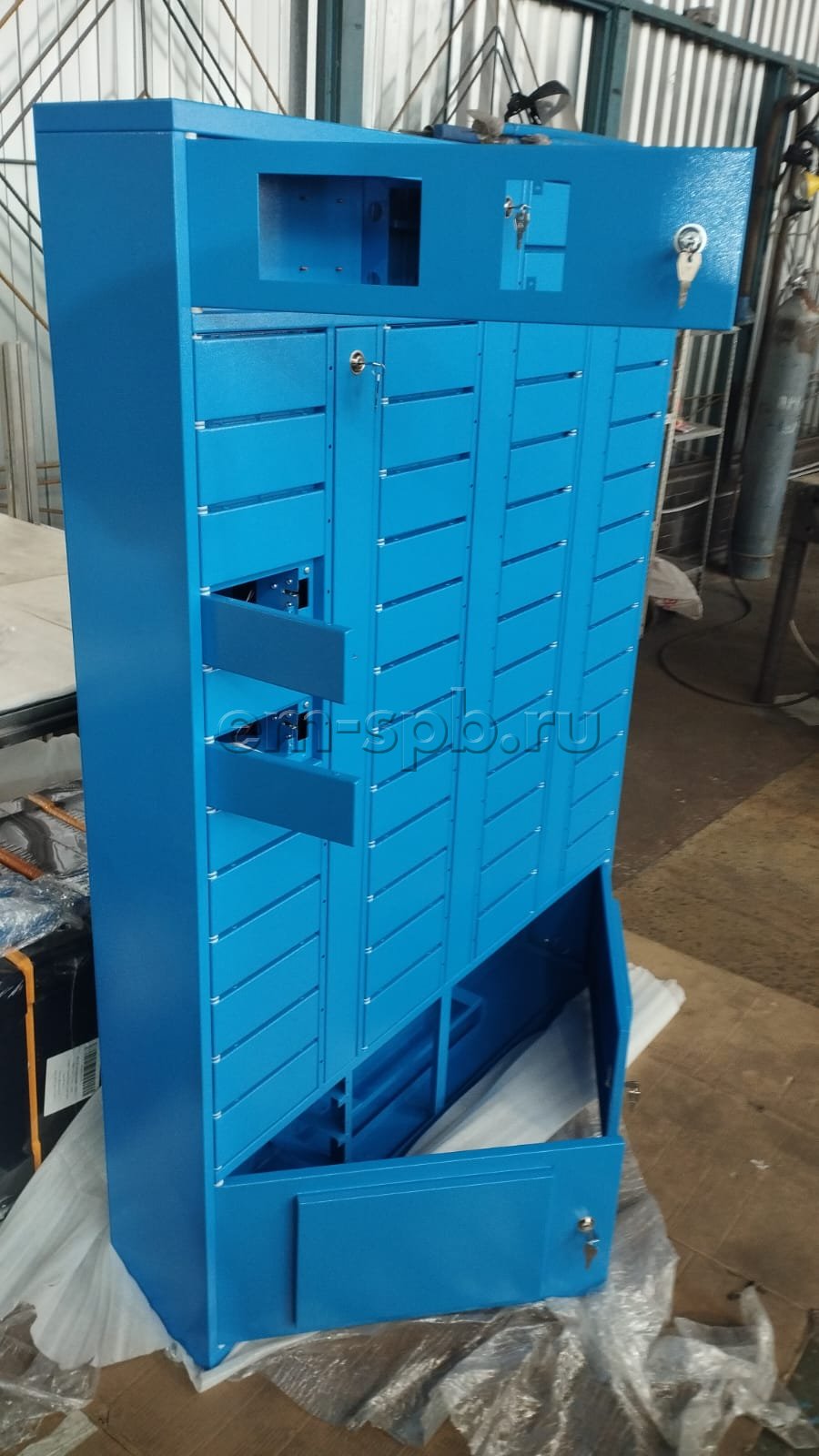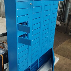 Выполнили проектирование и изготовление постамата в небесно-голубом цвете.
